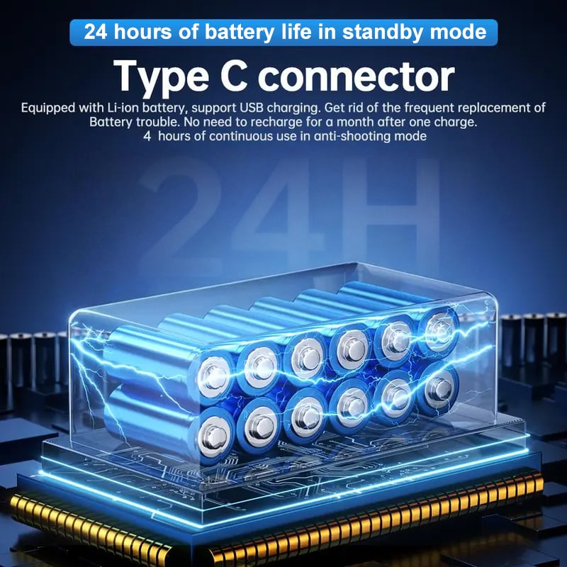 With 24 hours of standby time on a single charge and a Type-C connector for convenient USB charging, this device eliminates the hassle of frequent battery replacements. Once charged, it can operate continuously for 4 hours in anti-shooting mode, providing reliable, month-long security without constant recharging.