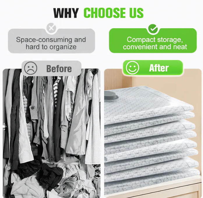 SPACE-SAVING DESIGN: Achieve up to 80% more storage space with our high-strength vacuum bags. Perfect for travel, seasonal clothing, or bulky bedding. The airtight seal locks out air, keeping items compact and organized.