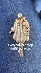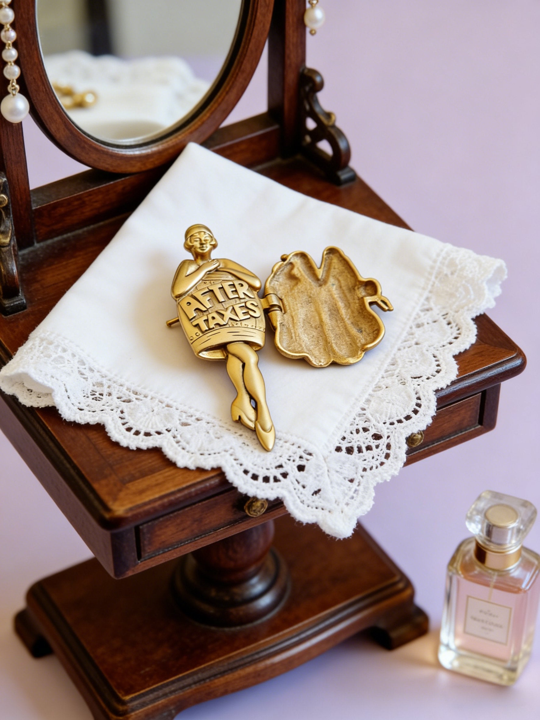 Standing at approximately 3″ tall, this figural brooch features a stylish woman in a luxurious fur coat — glamorous on the outside, funny on the inside. When you open her coat, she’s revealed wearing a barrel marked “After Taxes,” a cheeky commentary on life after the tax collector comes calling.